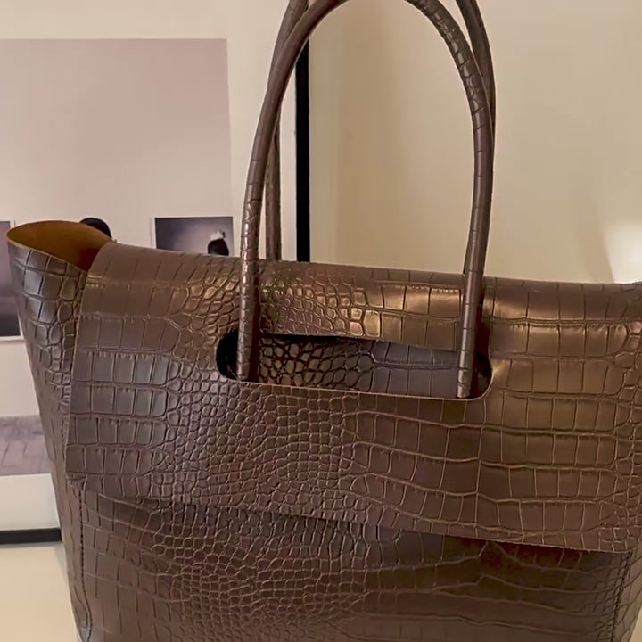 A tribute to timeless Parisian sophistication, The Marceau commands attention with its sculpted silhouette and croc-embossed texture, this structured tote is your power move in bag form. Spacious yet elegant, it features an integrated top-handle design and a flap closure that blends structure with statement. Whether paired with a tailored trench or a silk blouse, The Marceau transitions effortlessly from weekday power moves to weekend refinement.