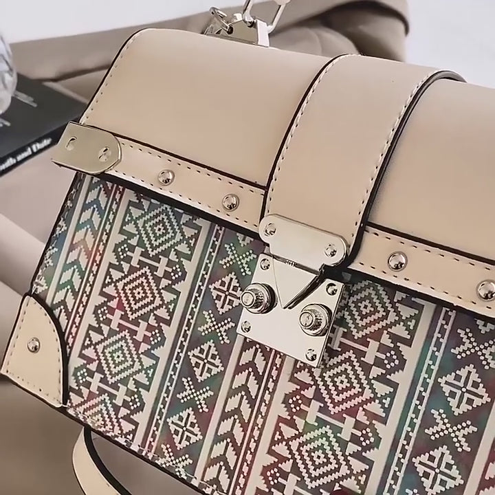 Vintage trunk meets runway cool. The Valentina is your mini power move—crafted for the woman who commands a room with poise and edge. With its geometric etching and bold silver clasp, this structured satchel is made to be admired, not just carried.